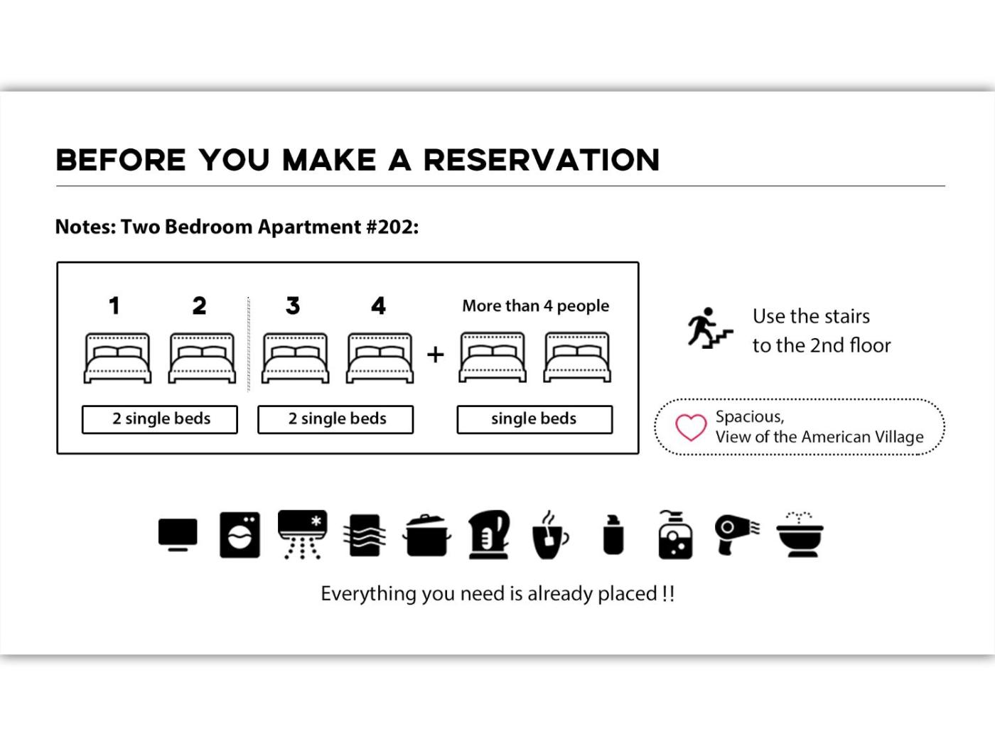 Two-Bedroom Apartment. The spacious apartment has 2 bedrooms and 1 bathroom with a shower and free toiletries. In the well-equipped kitchen, guests will find a stovetop, a refrigerator, kitchenware and a microwave. This apartment features air conditioning, a washing machine, a flat-screen TV and a balcony. The unit has 4 beds. ;