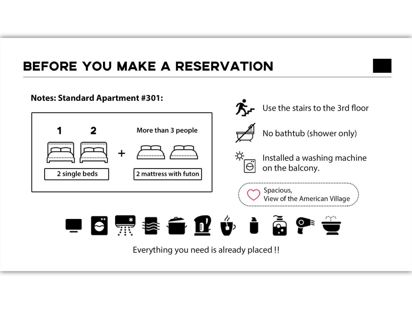 Standard Apartment. The air-conditioned apartment features 1 bedroom and 1 bathroom with a shower and a bidet. In the fully equipped kitchen, guests will find a stovetop, a refrigerator, kitchenware and a microwave. Featuring a balcony, this apartment also offers a washing machine, a tea and coffee maker and a flat-screen TV. The unit offers 2 beds. ;