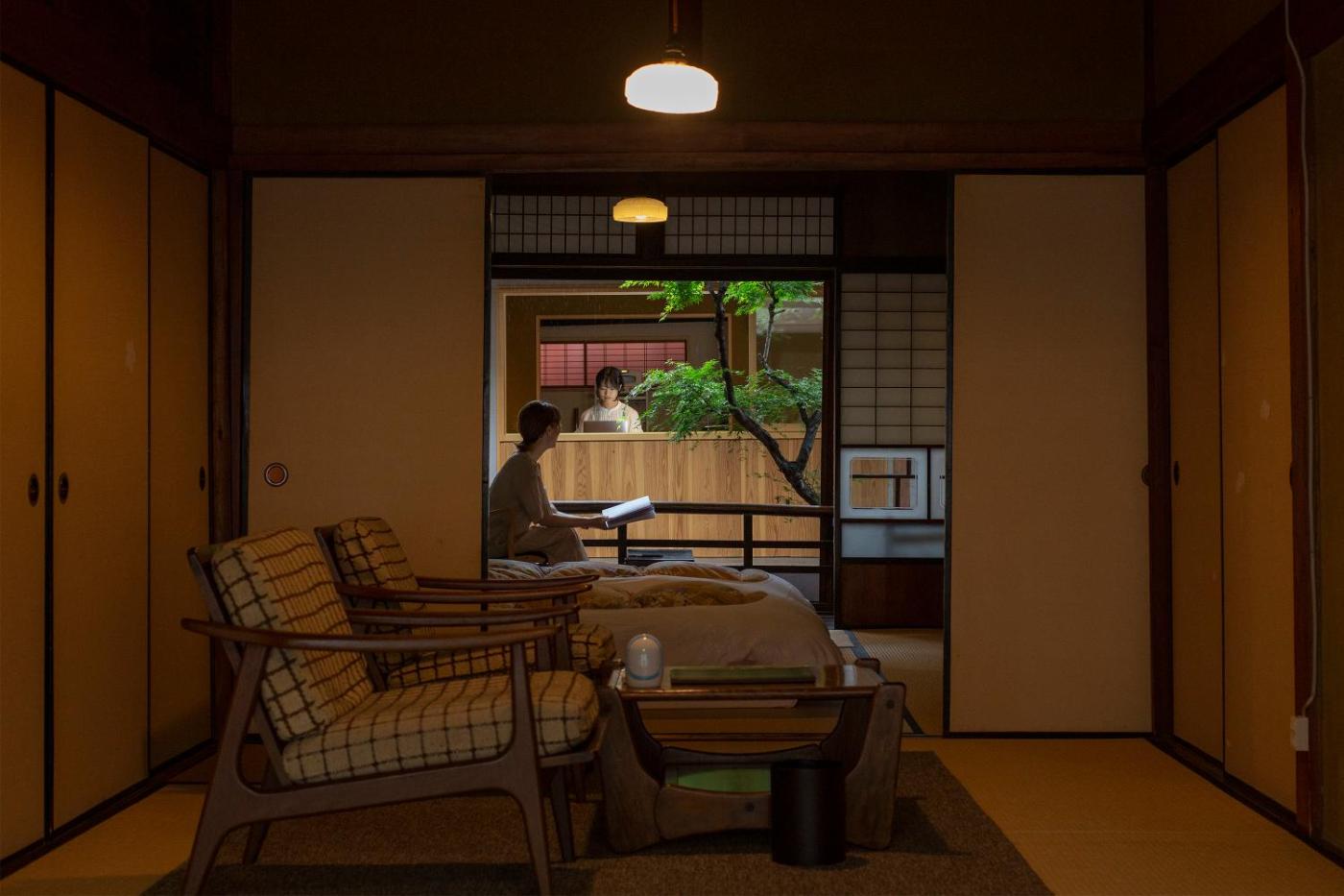 Japanese-Style Townhouse. A comfortable living room comes with a low table and seating cushions. A microwave, a fridge and an electric kettle are included in the kitchenette on the ground floor. Bedrooms are situated upstairs, and guests sleep on traditional futon bedding on tatami (woven-straw) flooring.