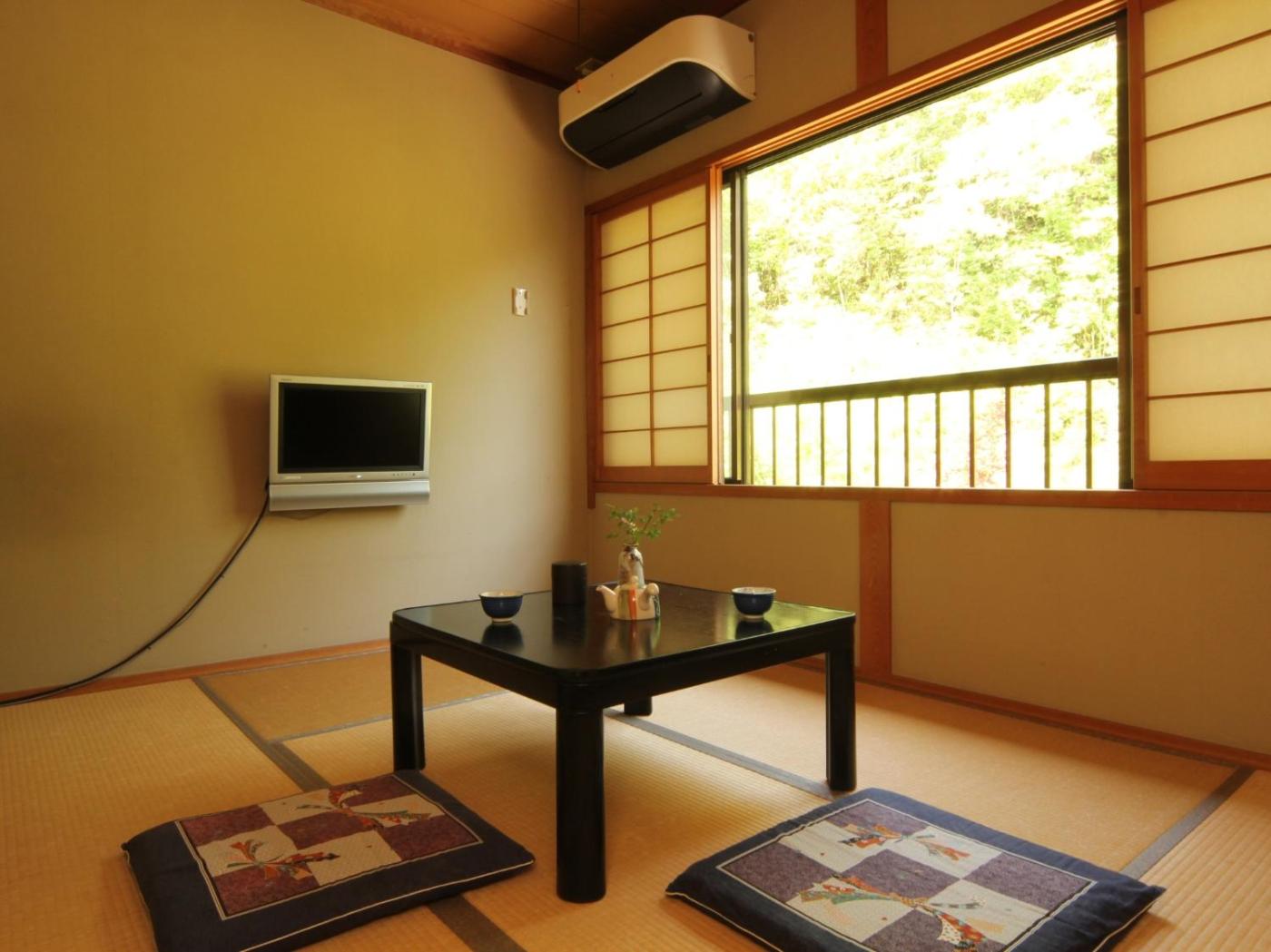 Quadruple Room. Providing free toiletries, this quadruple room includes a shared bathroom with a bidet and slippers. The air-conditioned quadruple room provides a flat-screen TV, tatami, a seating area, a safe deposit box as well as mountain views. The unit offers 4 futons. ;