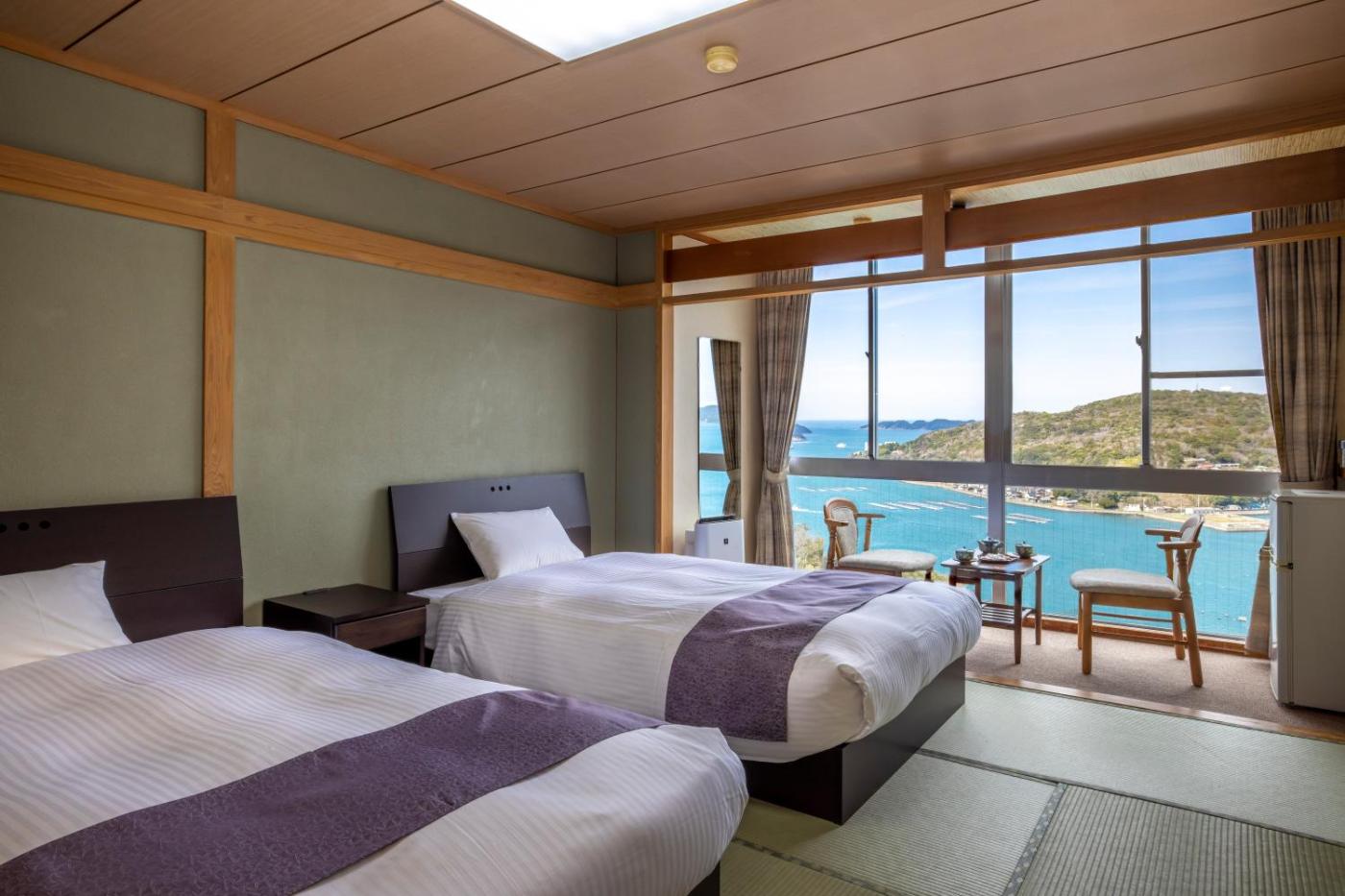 Standard Twin Room with Sea View. The twin room features air conditioning, tatami, as well as a private bathroom boasting a bath and a shower. The twin room offers a safe deposit box, an electric kettle, heating and a flat-screen TV. The unit has 2 beds.