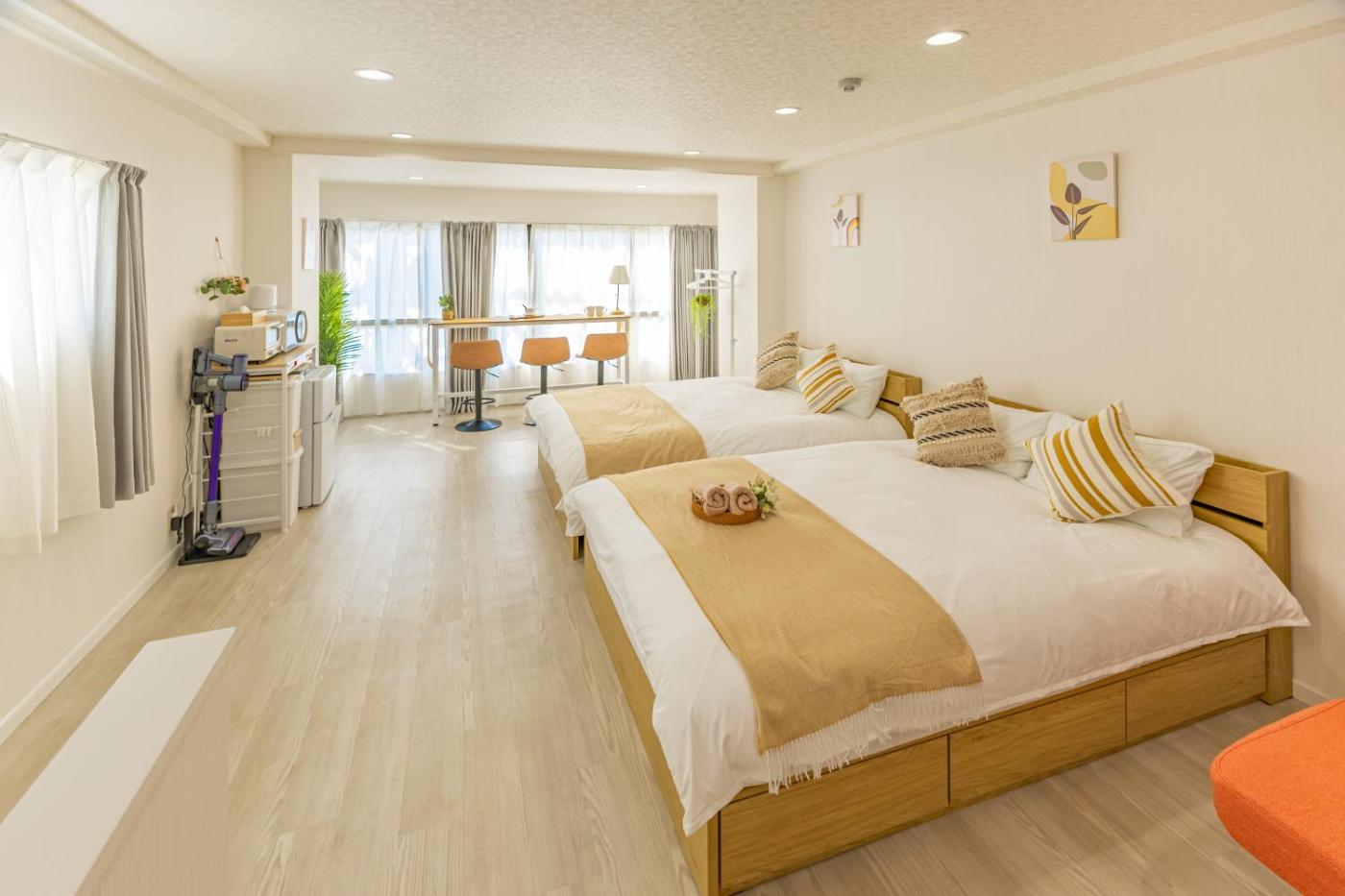 Quadruple Room. The quadruple room offers air conditioning, a washing machine, as well as a private bathroom featuring a walk-in shower and a hairdryer. The well-fitted kitchen features a stovetop, a refrigerator, kitchenware and an oven. The quadruple room is furnished with a desk and a seating area and provides soundproof walls, a dining area and city views. The unit offers 2 beds. ;